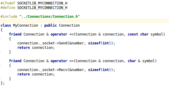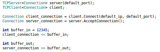 There are Socket and Connection classes. You can inherit from Connection class and override << and >> operators for every class you want to transfer. Socket classes are not for direct use.
