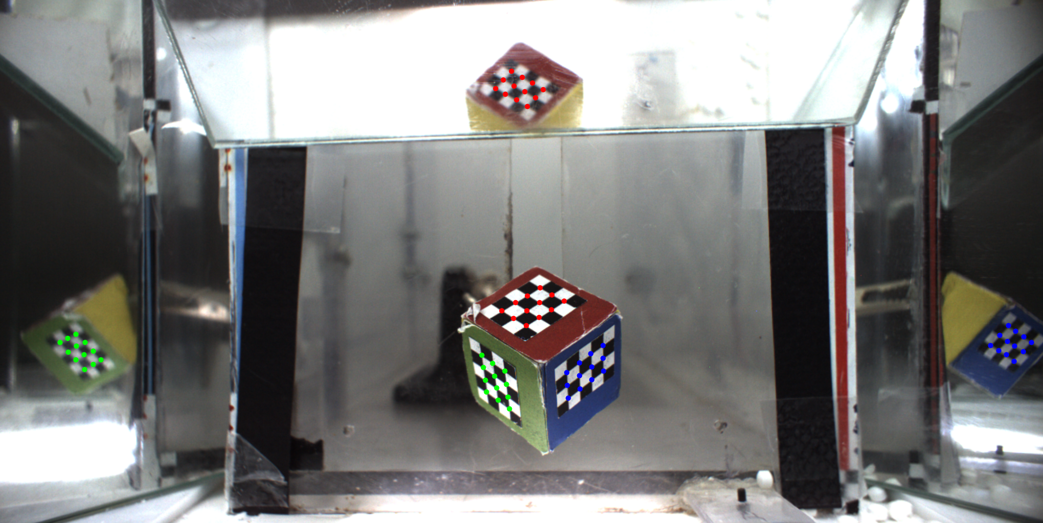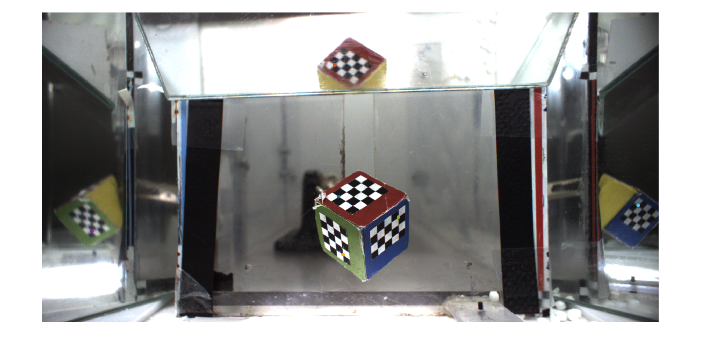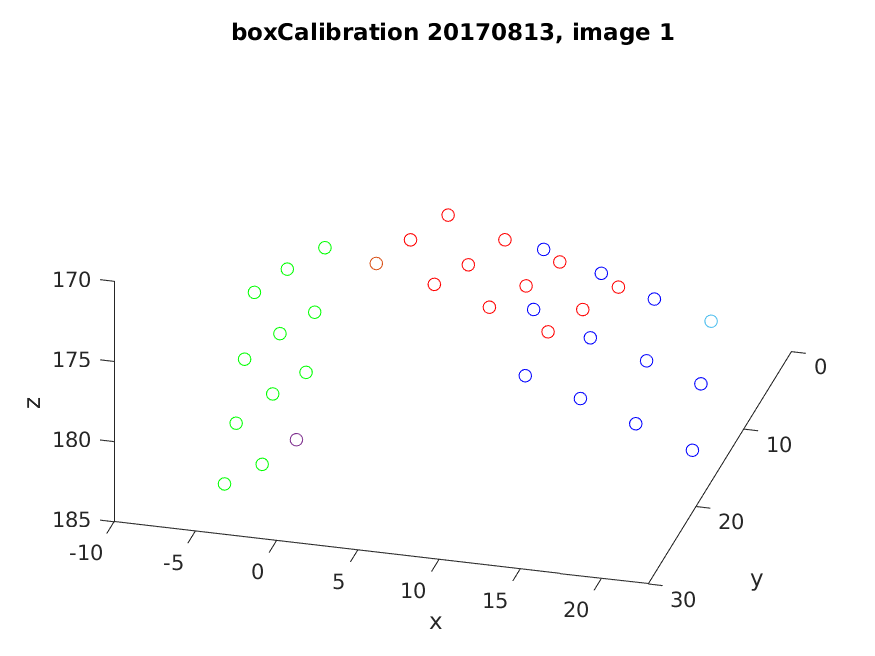 - In MATLAB, run the ‘checkBoxCalibration’ script. The same prompts present in the ‘calibrateBoxes’ script will appear. This will create a new folder, ‘plots’ in the calibration images folder. Each date will have a subfolder containing the images and several MATLAB .fig files, which should be viewed in order to verify that box calibration was completed accurately. Note: Differently colored dots in the calibConfirm_YYYYMMDD_#.png files represent the matched dots in the pointConfirm_YYYYMMDD_#.png files. Example of calibration check: