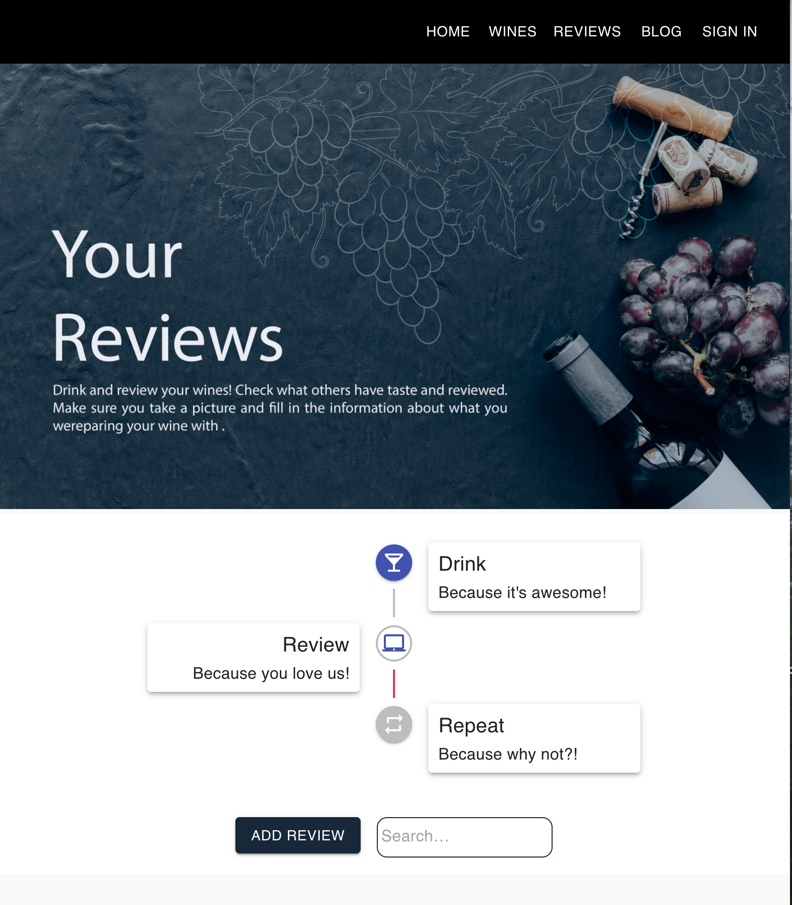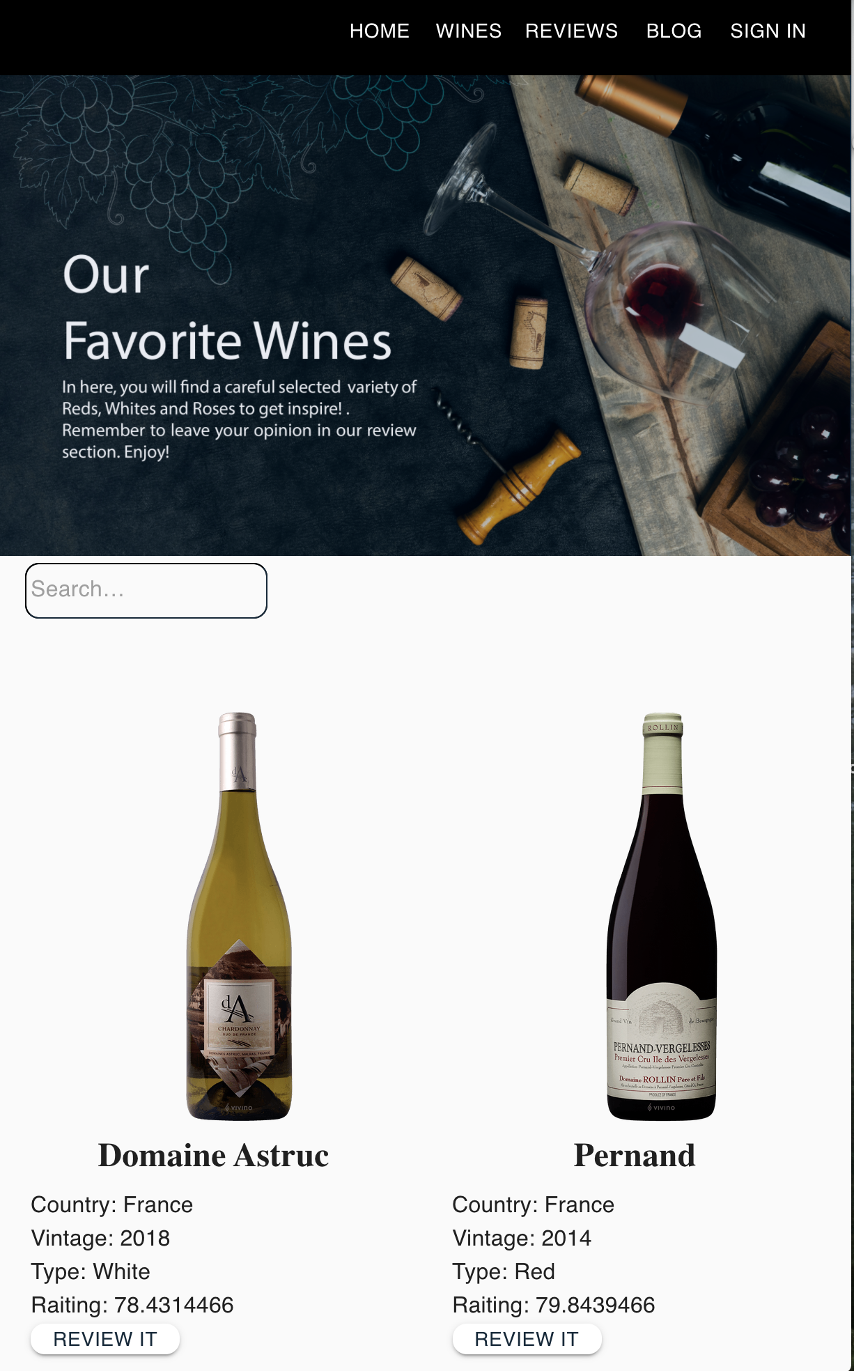 On the Wine List, we have a suggestion of our favorite wines, click the button review and it will take you to the review page.Also the search section will allow the user to search for the wines by type: red, White or Rosé.