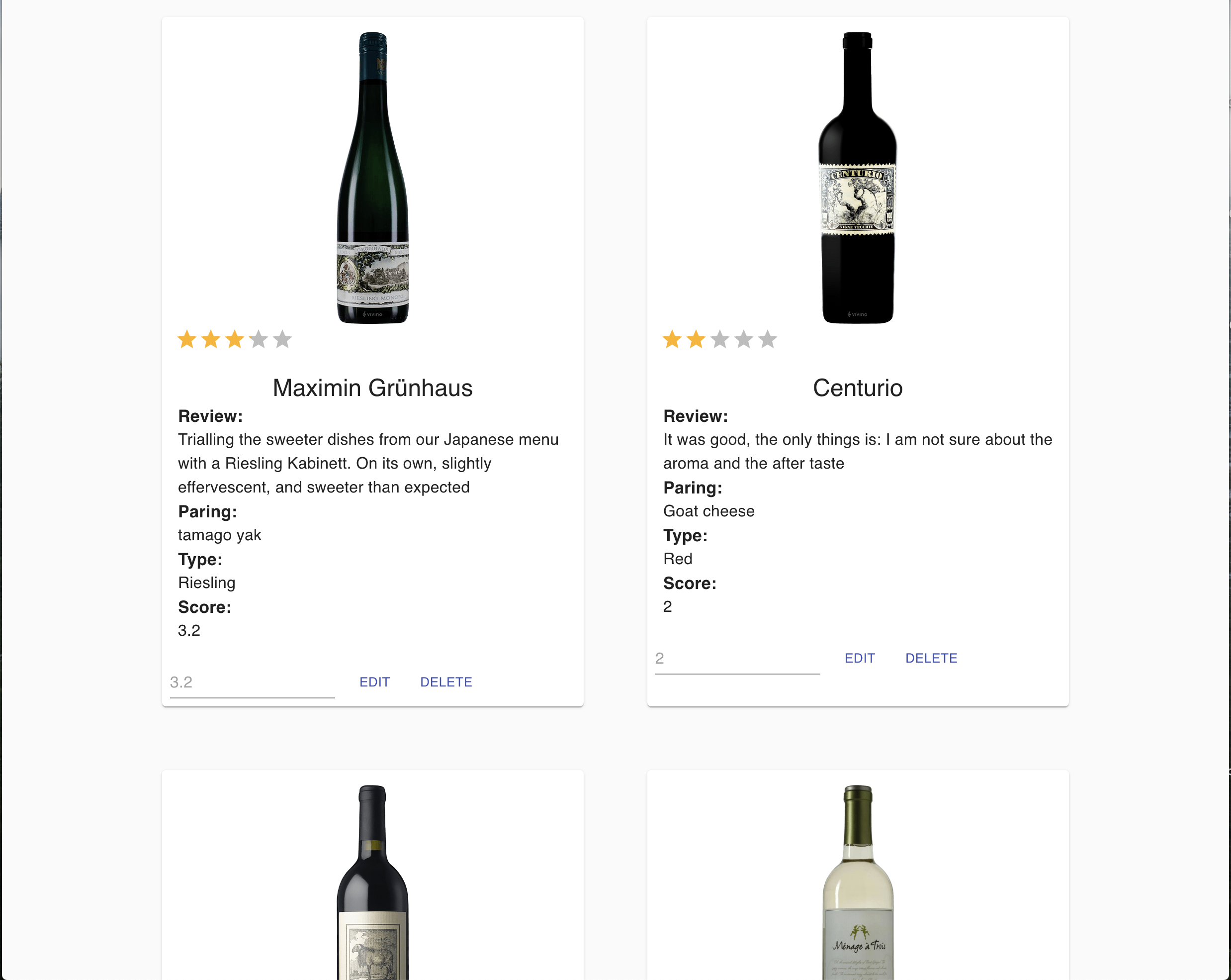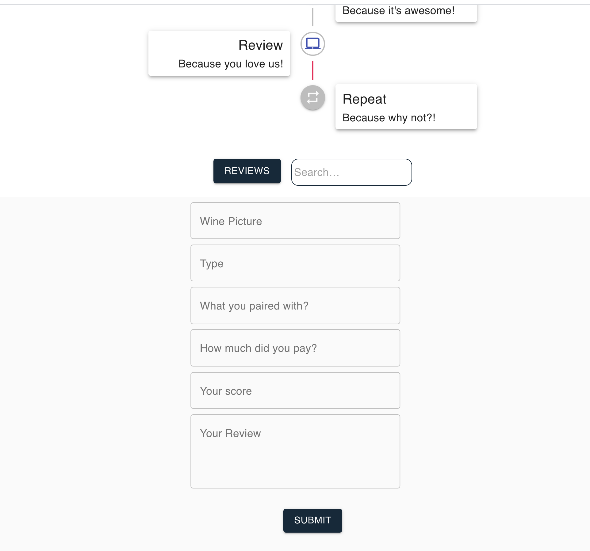 Review Section will show a series of wines users have tried and review. The user have the option to edit the score and to delete the reviews. Also the form to sumbmit a new review contains: URL picture, type of wine, what the wine was paired with, score, how much the user payed for the picture and the thoughts about the wine.
