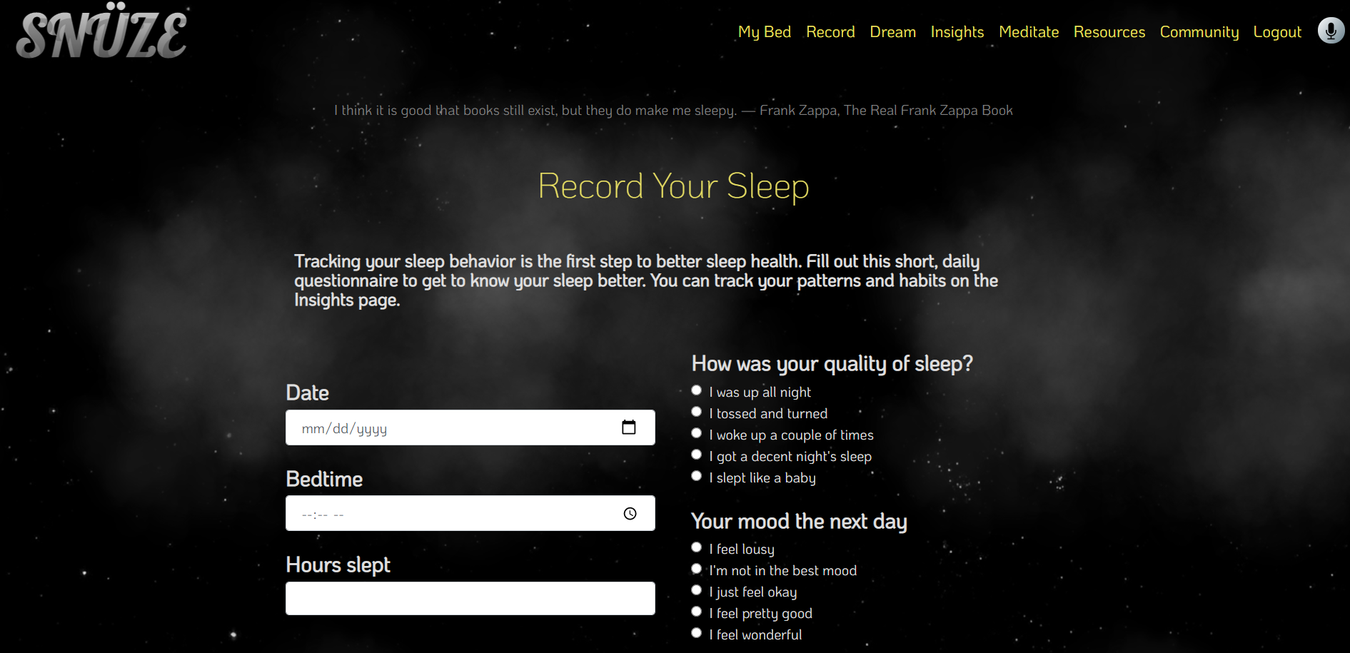 Snuze is a tranquil React app, and was designed to meet the needs of users who want some extra help to fall asleep comfortably. Snuze users benefit from free access to relaxing audio, nightly sleep quality tracking, data-based resource recommendations, an online community of other Snuzers, speech-based journaling and site navigation, and so much more. Don't sleep on Snuze - visit us tonight!