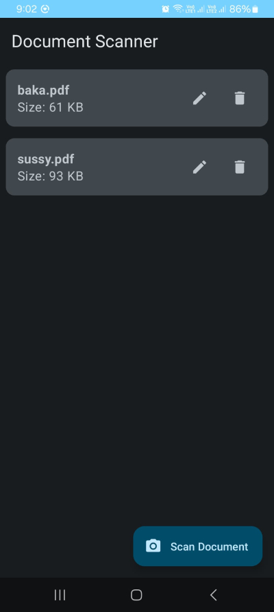 Document scanner showing saved PDFs (e.g., baka.pdf, sussy.pdf).