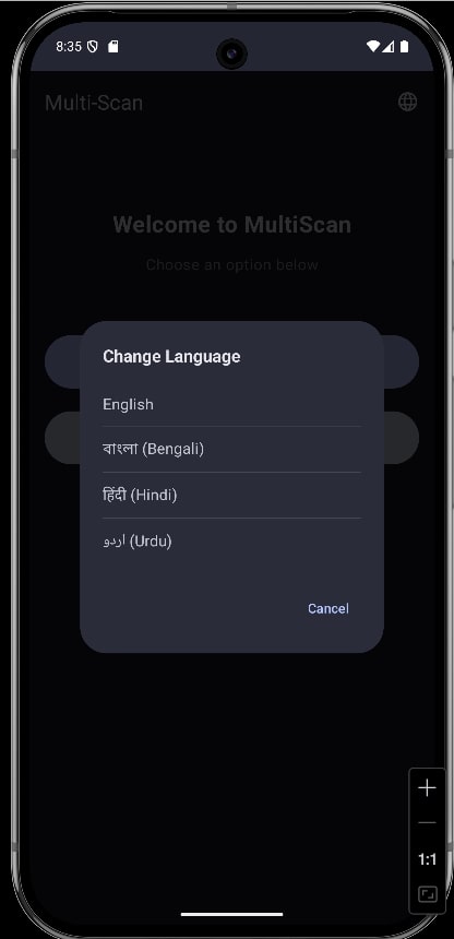 - The home screen also has the option to change the app language, which supports up to 4 languages.