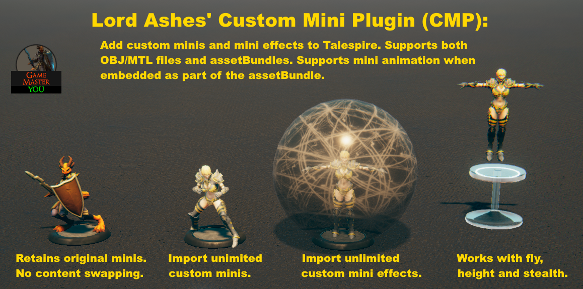 This unofficial TaleSpire plugin is for adding an unlimited number of custom minis. Re-applies transformation automatically on re-load and requires no blank base. Now supports assetBundles, assetBundle animations and emotes.