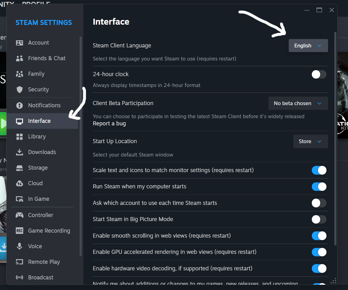 The entire modlist is designed to be played in English. The installation process may fail upon running Wabbajack if you do not do so ahead of time. Steps consist of clicking Steam on the top left of your Steam inferface app window, select Settings (Steam Settings), select Interface, and click English in the top box. A preview can be seen below.