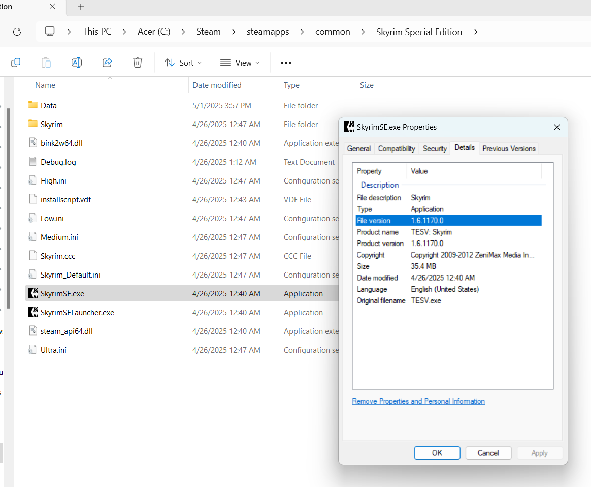 Make sure your game is fully up to date in Steam. The version number should say 1.6.1170. You can check to see if your version is the most up to date by locating SkyrimSE.exe via your Steam folder (ie. C:\Steam\steamapps\common\Skyrim Special Edition), right-clicking the .exe file, select Properties, swap from General to the Details tab in the small pop-up window, and the number will be listed under File Version. An example image can be found below. Everything will be automatically patched by Wabbajack, however, it requires the latest game files.