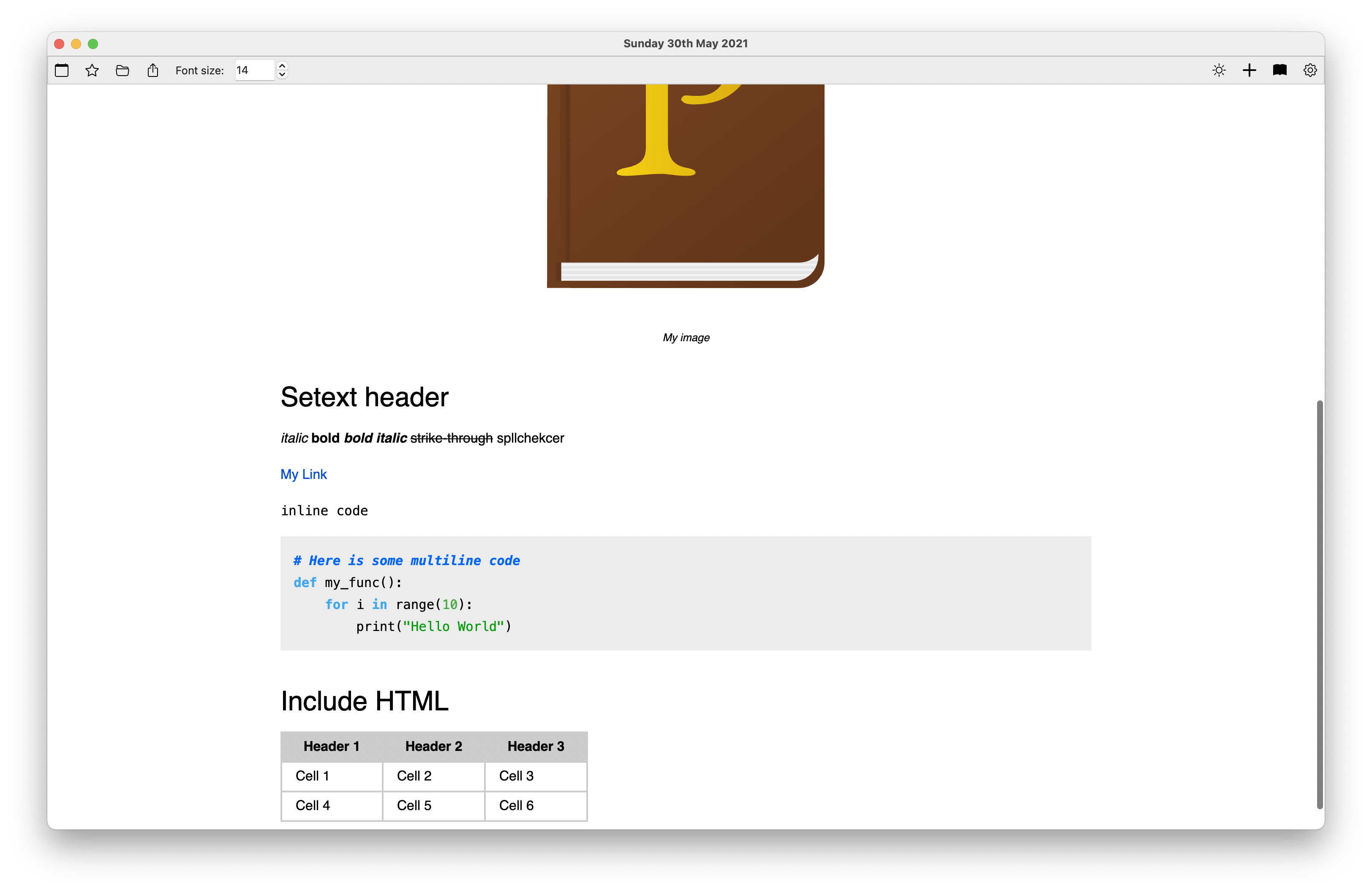 Pepys also uses pandoc syntax, with support for pandoc conversions to other formats. This means that all your entries can be converted completely to HTML, PDF, LaTeX, Microsoft Word, EPUB, and more!