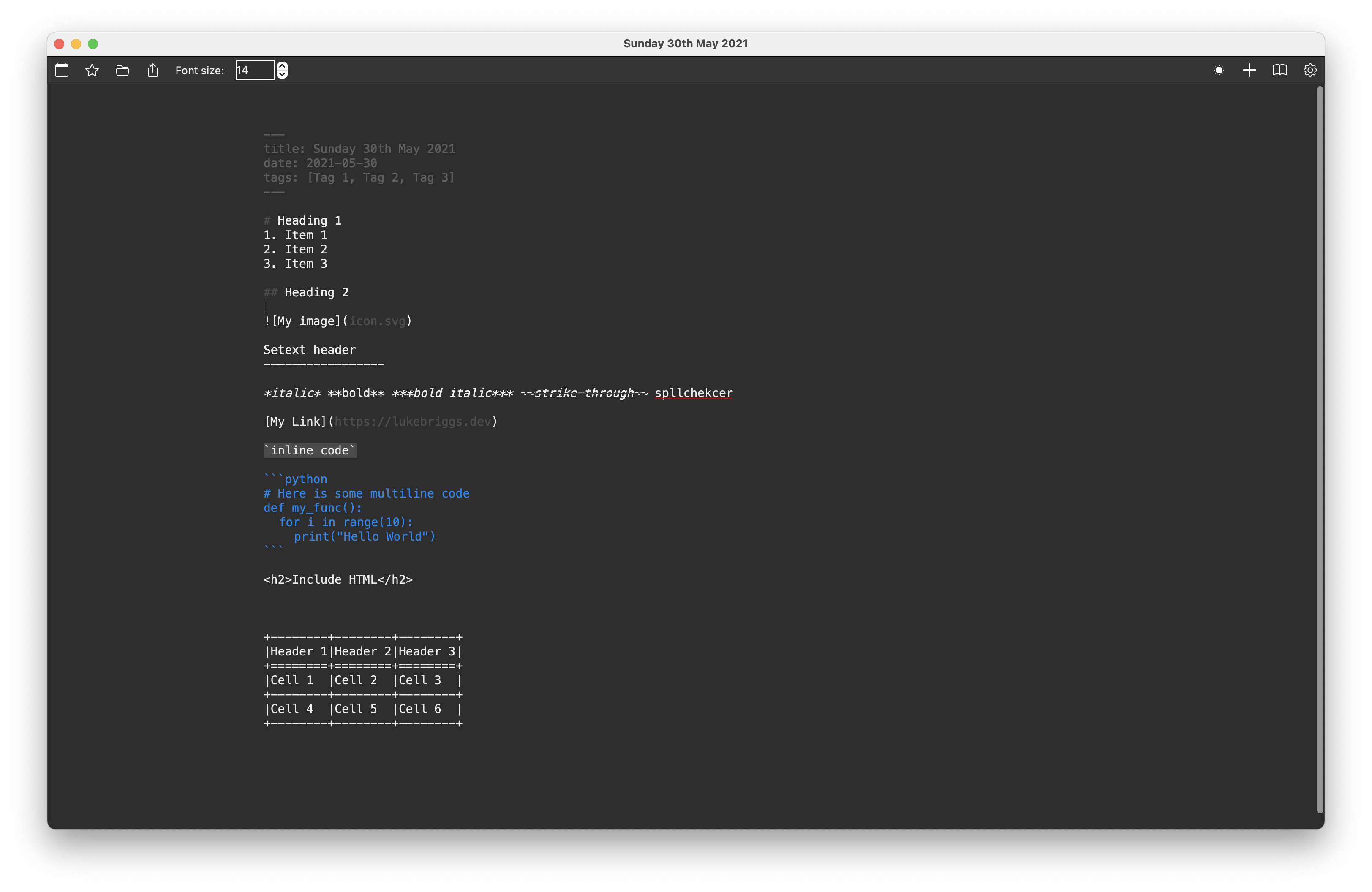Pepys provides highlighting for key Markdown syntax in a clean and focus-driven design. Bold is bold, code is clear from text, and tags and urls don't clutter your view.