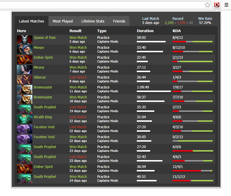 Dotabuffer is an extension for Chrome and Opera that lets you view some of your stats that are available on dotabuff.com in a quick access dropdown window.
