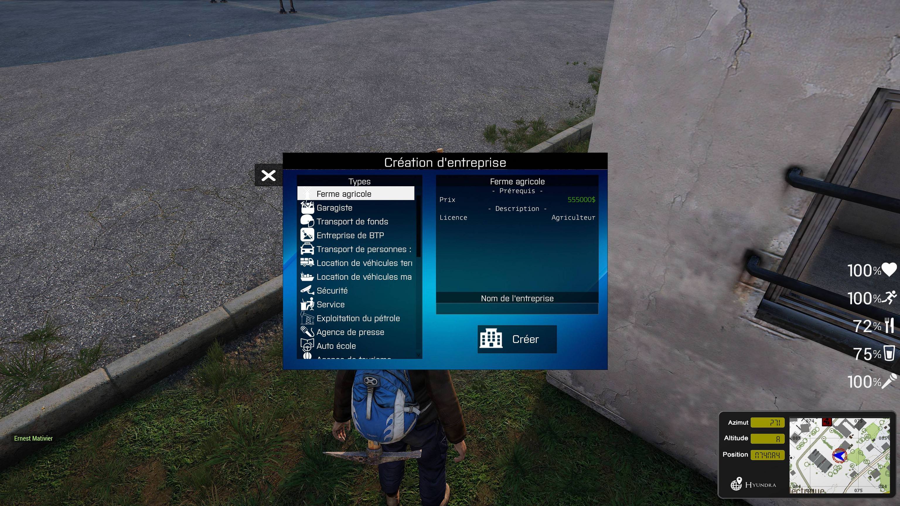 Q: How to create a company ? A: In order to create a company, the player in charge of registering companies (the one with the "coop_agri" license) has to press the interaction button (windows by default) while targeting the new CEO. He will have an option in his interactions menu to create a company. He has to specify the company type and name. When pressing enter a construction block will appear and players will be able to gather and put materials in it. If you want to skip the construction part as admin you can while targeting the construction block, go to the admin app and press "construire" (build) If you don't have access to the admin app you can register your UID and permissions here.