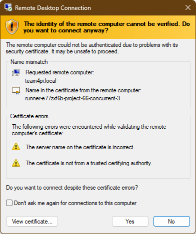 There will be a warning about the computer's certificate. Feel free to select "Don't ask me again for connections to this computer" and click "Yes" to connect.