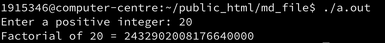 printf("Factorial of %d = %ld\n", n, multiplyNumbers(n));