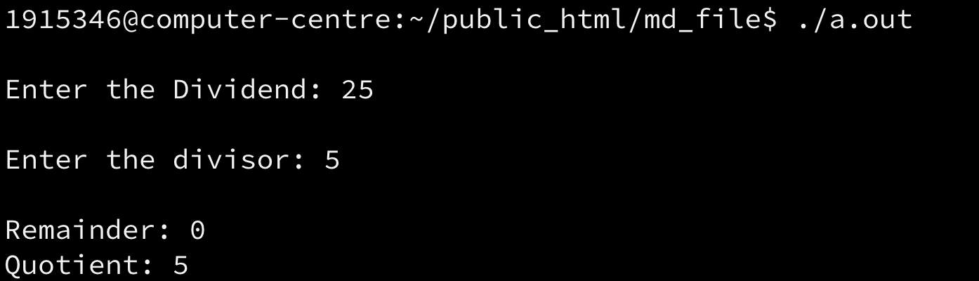/* To find quotient and remainder */#include<stdio.h>intmain() {
