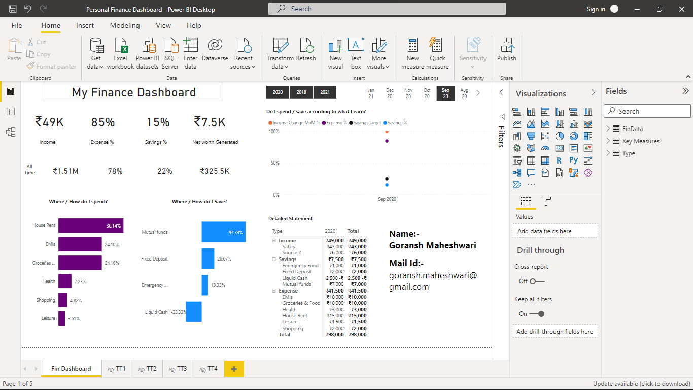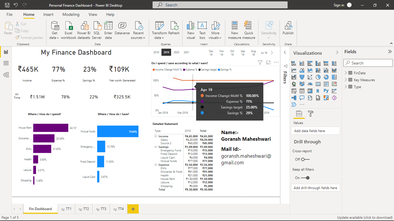 It's PowerBi dashboard which will help to analyse data in less time. It will visualize using different types of Graphs, Charts and many more. Shows House Rent, Mutual Fund, EMIs, Health, Shopping, Fixed Deposit e.t.c and it will save time and will help to analyse financial status in easy way.
