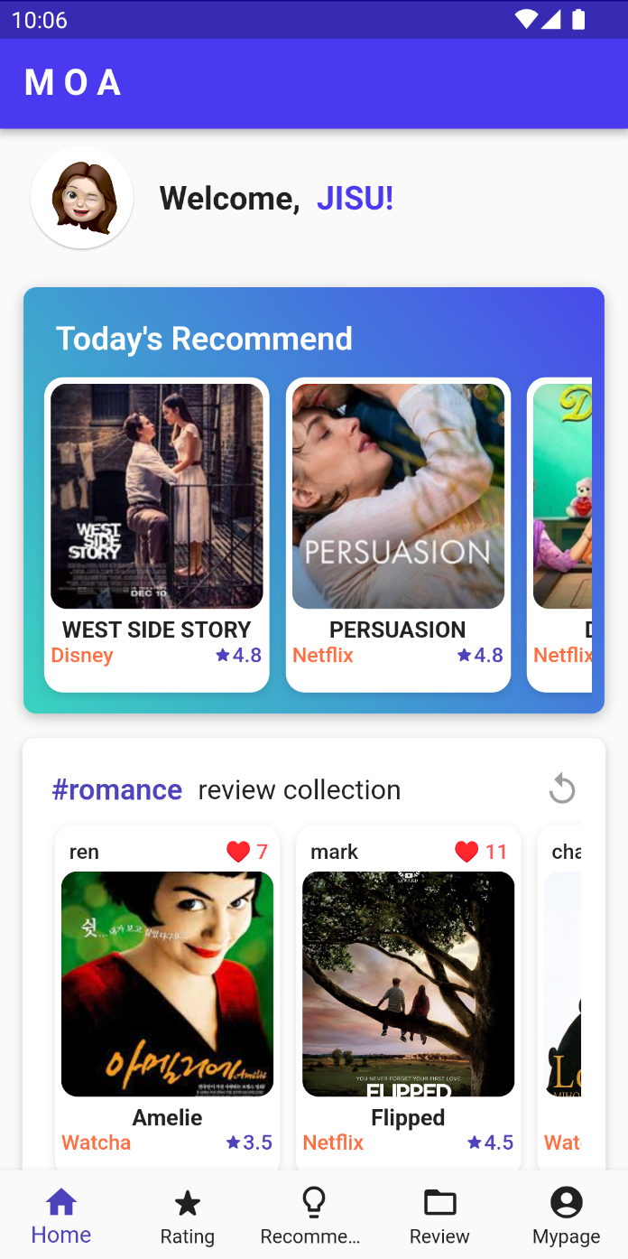 MOA는 사용자의 취향을 리뷰와 콘텐츠 평가 데이터를 기반으로 분석해, 사용자 맞춤 OTT 플랫폼 및 콘텐츠를 추천해주는 애플리케이션📱입니다.