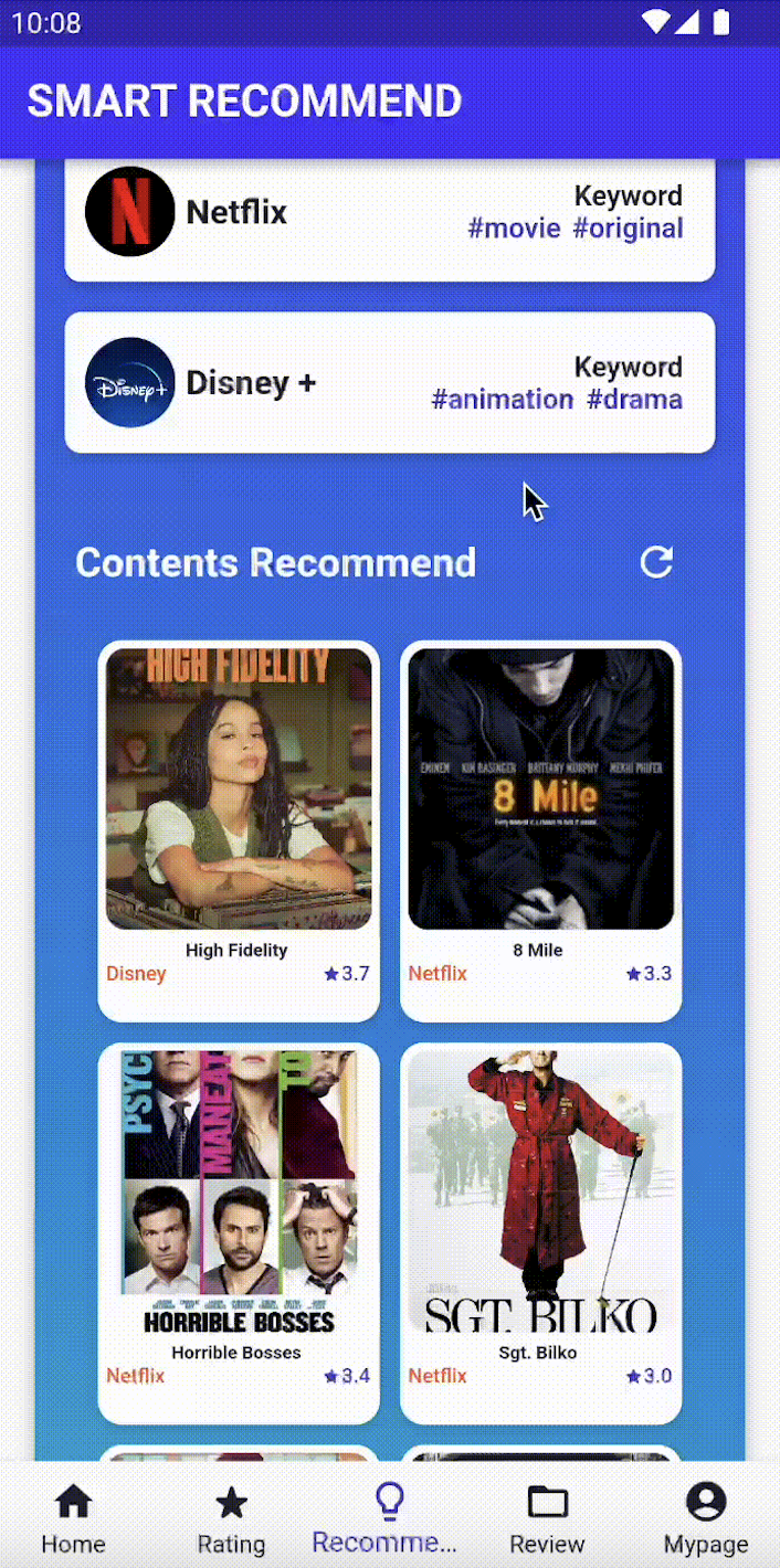 추천 알고리즘을 기반으로 사용자 취향을 반영한 플랫폼 및 콘텐츠를 추천해줍니다. 새로고침을 할 때마다 새로운 추천 콘텐츠를 확인해볼 수 있습니다.