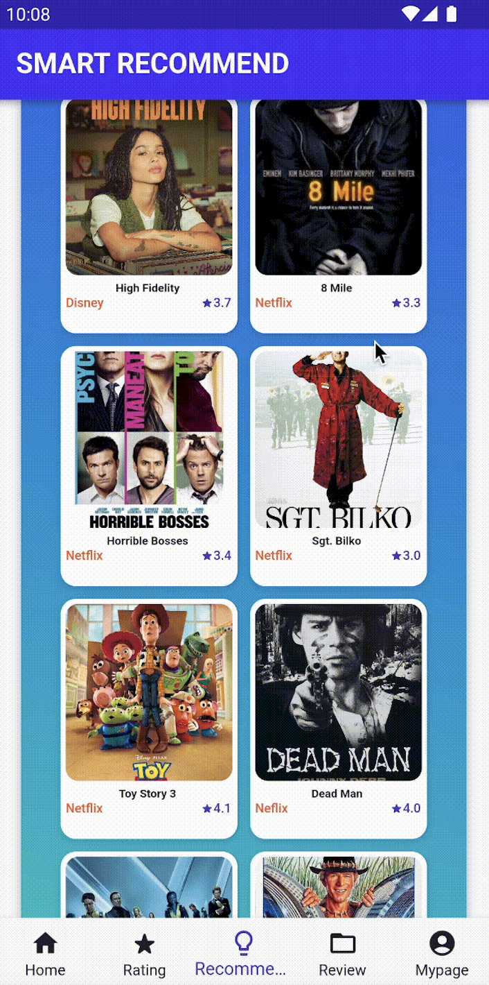 무작위로 업데이트되는 콘텐츠에 별점을 매기면서 간편하게 평가할 수 있습니다. 이 평가 데이터는 콘텐츠 추천을 위한 알고리즘 학습 데이터로 사용됩니다.