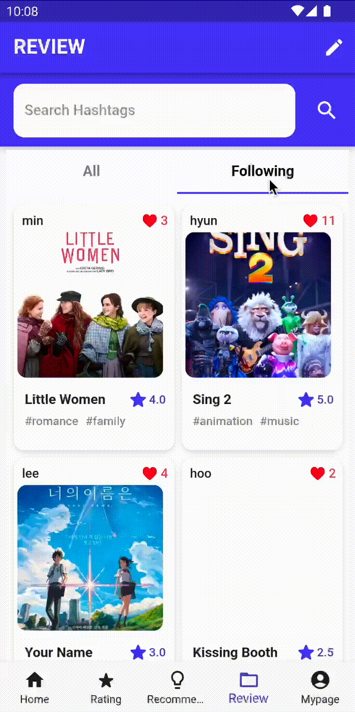 다양한 리뷰들을 읽고 쓸 수 있는 탭입니다. 팔로잉한 사용자의 리뷰만 모아볼 수 있습니다. 리뷰 상세 화면에서 코멘트 뿐만 아니라 콘텐츠의 상세 정보까지 모두 확인할 수 있습니다.