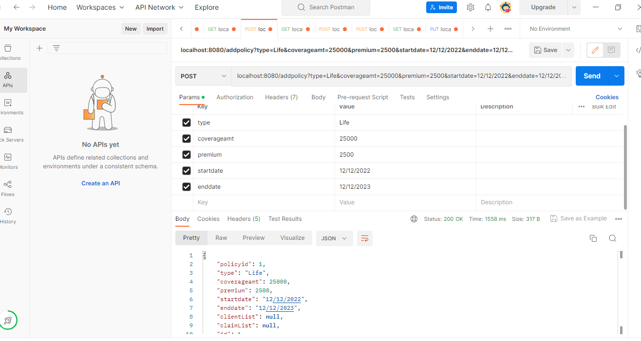 this api (localhost:8080/addpolicy?type=Life&coverageamt=25000&premium=2500&startdate=12/12/2022&enddate=12/12/2023)