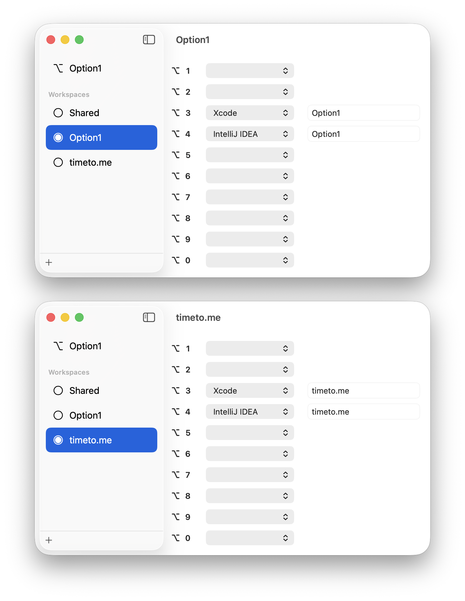 I work on two projects: Option1 and timeto.me. I got used to press ⌥-3 to open Xcode. It means when I work on Option1 I want ⌥-3 opens Xcode - Option1, but when I work on timeto.me the same ⌥-3 should open Xcode - timeto.me.
