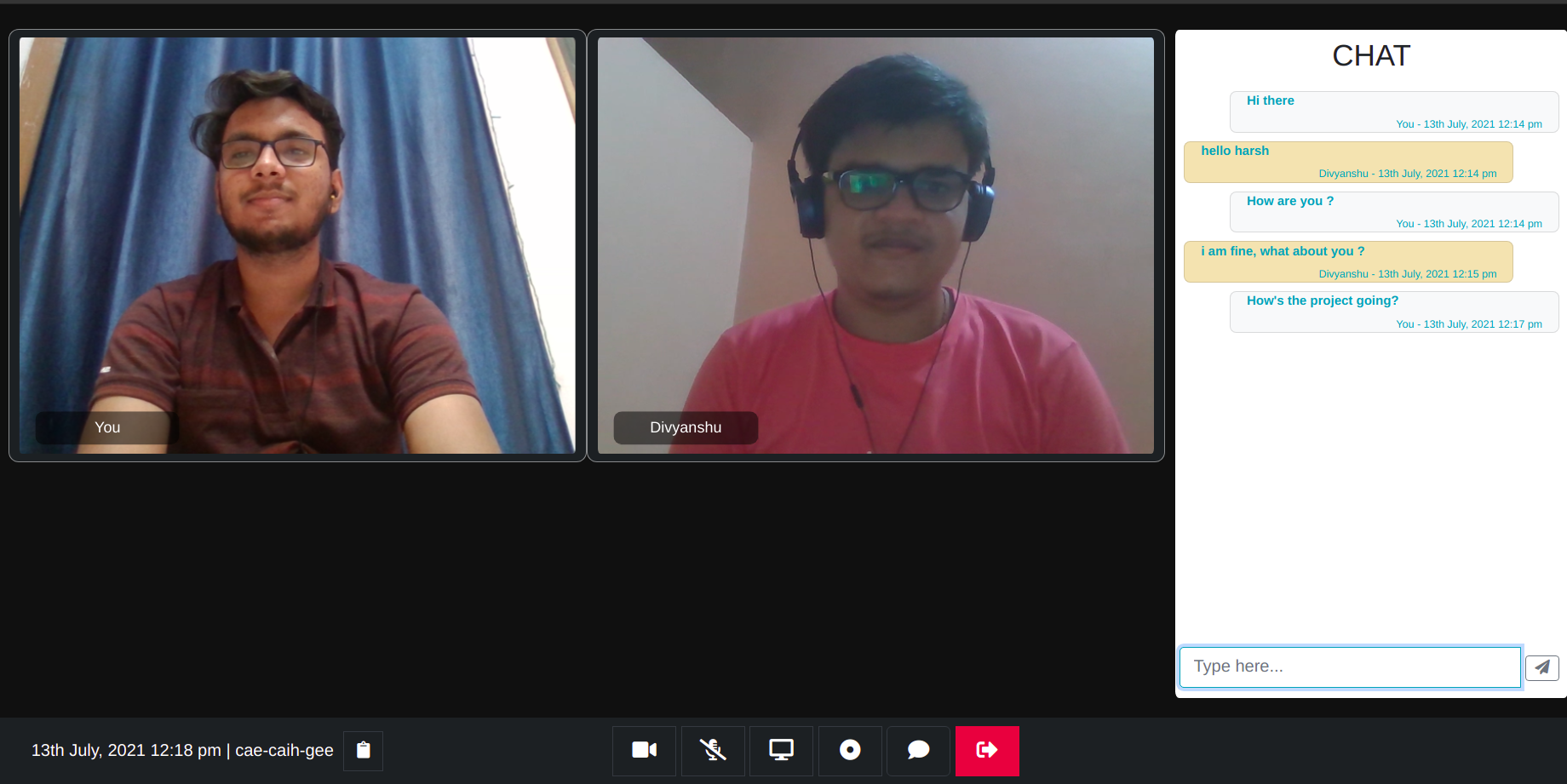 - All the chats ie. meeting'chat and dashboard's chat are synced. Users can send/ recieve messages from the meet/dashboard both.
