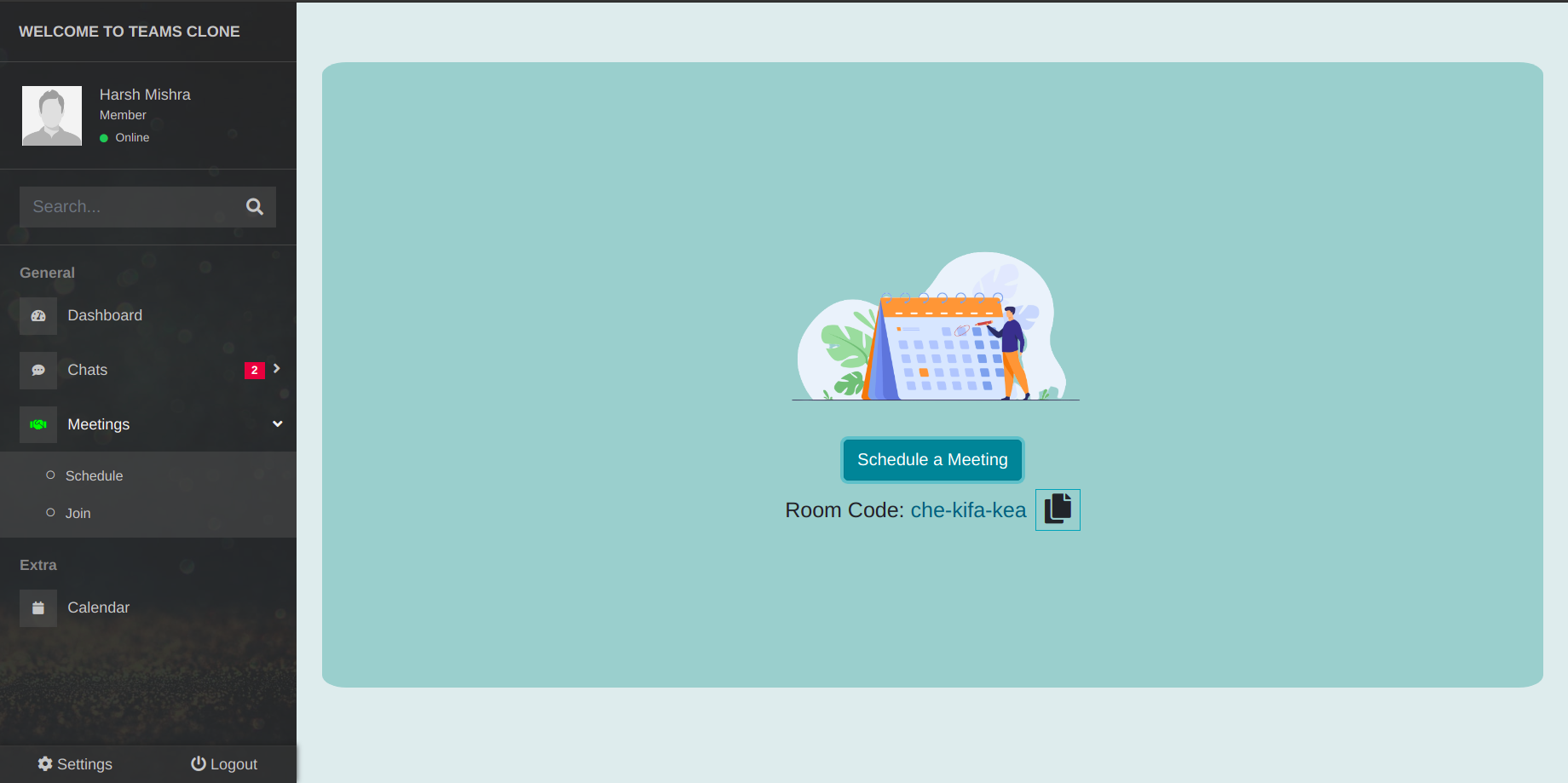 - Schedule a meet: User can create meeting rooms, and share them. Each time user creates a room, he is by default added to the room.