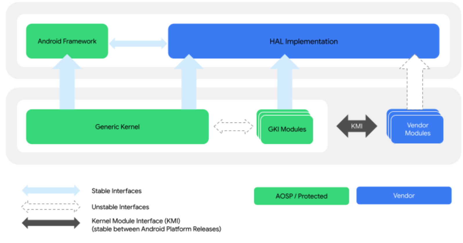 - GKI modules: Kernel modules built by Google that can be dynamically loaded on devices where applicable. These modules are built as artifacts of the GKI kernel and are delivered alongside GKI as the