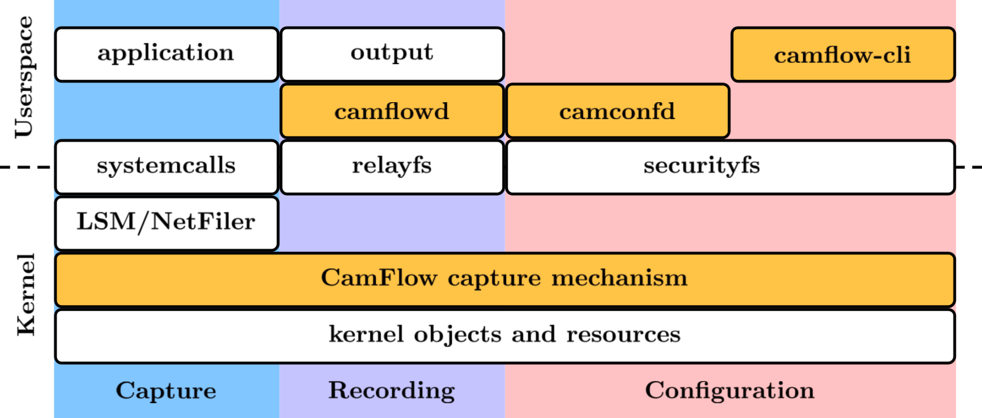 CamFlow provenance system consists of kernel space capture mechanism and user space daemons. The architecture is described below. For more information, check camflow.org