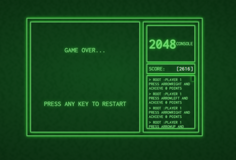 2048 CONSOLE 2048 game retro style made on pure javascript Author Miguel Angel Rodriguez - Front-End developer