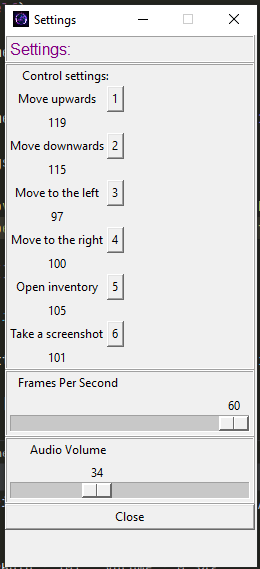 - Settings -- базові налаштування гри. Здебільшого присвячується налаштуванню клавіш керування персонажем. Також є налаштування аудіо та кількості передачі кадрів в секунду (FPS).
