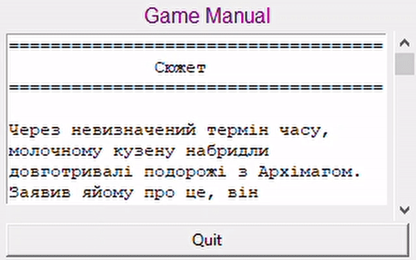 - Visit developer's website -- посилає користувача на сторінку (https://milkycousin.pythonanywhere.com/) з короткими розповідями від розробника, на основі яких безспосередньо "основана" сама гра.