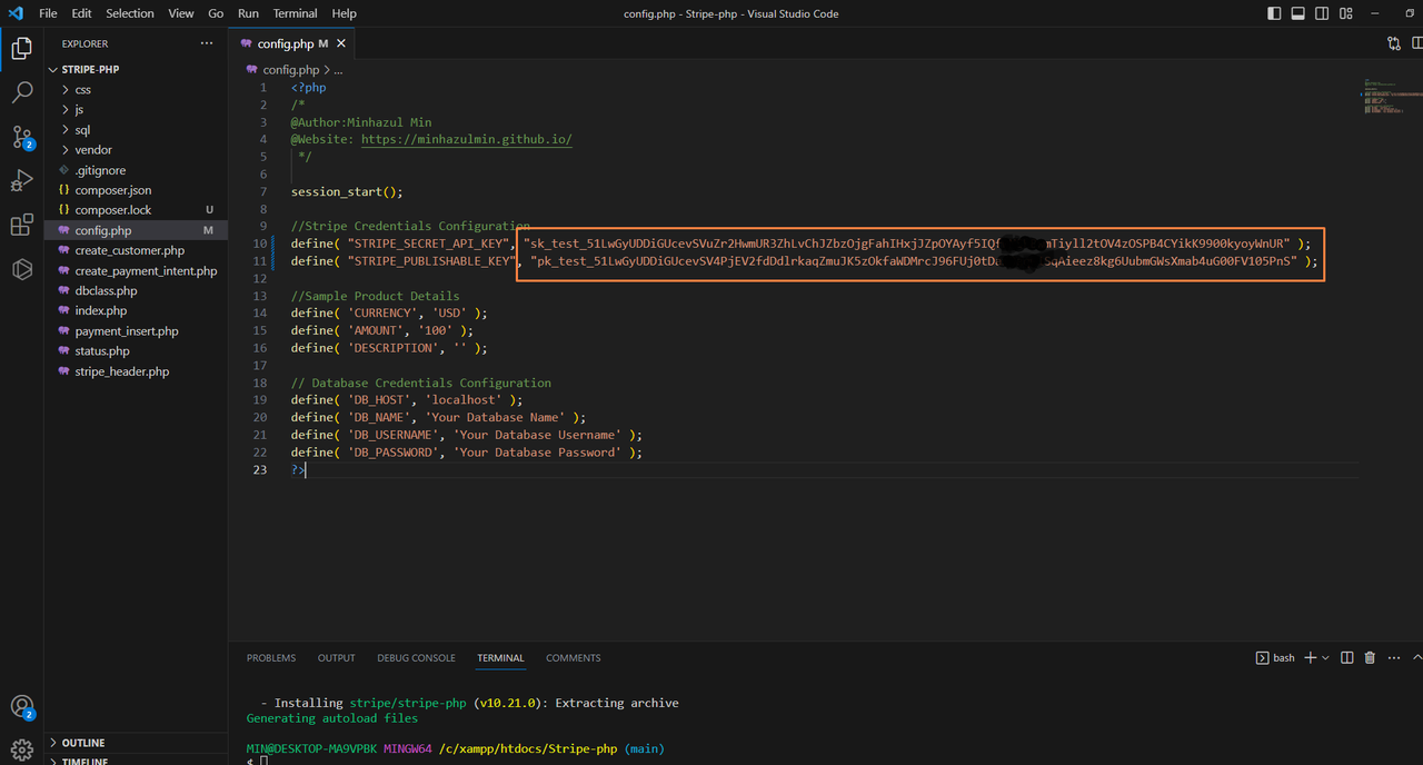 composer install[Step - 3] Update STRIPE_SECRET_API_KEY and STRIPE_PUBLISHABLE_KEY in config file: