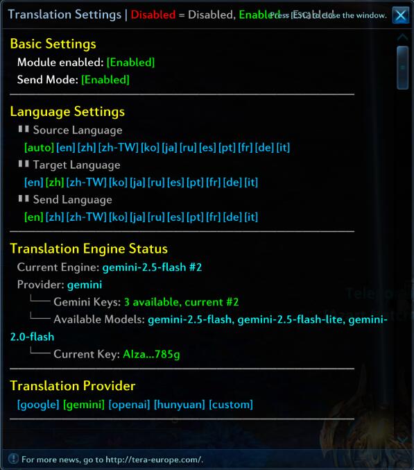 This is a real-time chat translation plugin designed for TERA, aiming to help players easily overcome language barriers and communicate seamlessly with players from around the world. It integrates various AI translation interfaces and localization features.