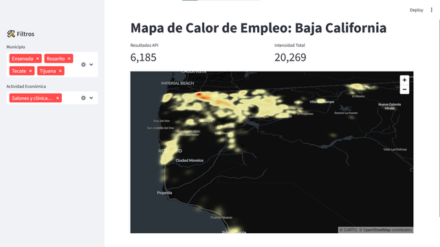 Interfaz web interactiva que consume la API, gestiona los filtros del usuario y renderiza el mapa utilizando capas de superposición (Deck.gl) sobre mapas base oscuros (Carto) para resaltar la intensidad de la actividad económica.