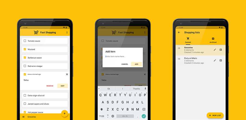 There are many people that don't want to use a voice assistant and find other apps available on the market too overwhelming, too complex, bloated with features, bloated with ads or simply overengineered for their simple problem. In the past, you would get yourself a piece of paper and a pen and write down the stuff you need to buy, so you can read it while being in the market. Fast shopping is an application that does exactly that and only that. Reducing number of taps to a minimum and offering a very readable interface.