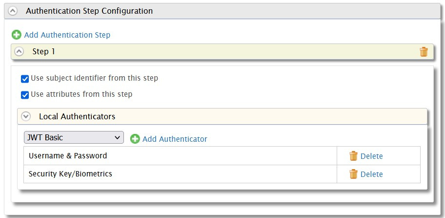 If you plan on testing a 2FA / MFA solution, just add more steps and configure them as you see fit (e.g. Username & Password in Step 1 and Security Key/Biometrics in Step 2).