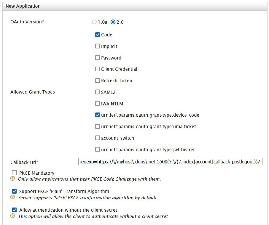 - Allowed Grant Types -> check Code and urn:ietf:params:oauth:grant-type:device_code