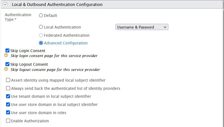 Now back to the service provider configuration page and expand Local & Outbound Authentication Configuration and click on the Advanced Configuration selectable option. This will bring you to a page where you can configure your authenticators.