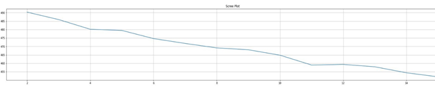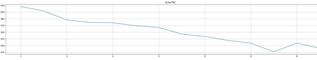 The function scree_plot() makes an elbow curve for different number of clusters by plotting Squared Sum of Errors against the number of clusters. If the graph shows an elbow then the corresponding cluster is the output but if there is no definite elbow, then the cluster corresponding to the lowest number of SSE will be the output value for number of clusters as determined by the plot. The figures below show scree plots made for each document term matrix: