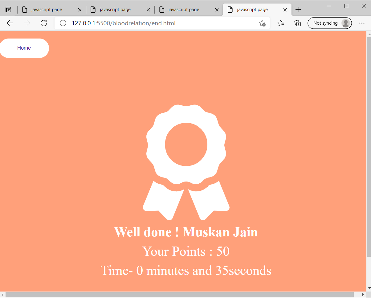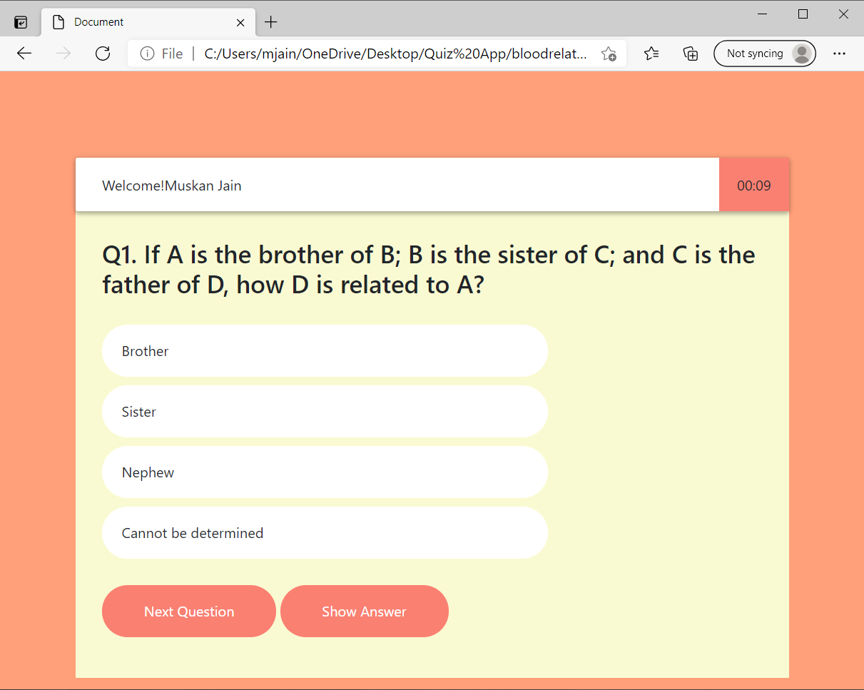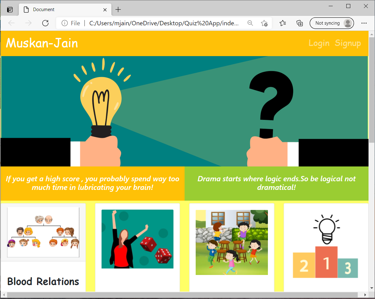 QUIZ-APP is a responsive web app developed in HTML ,CSS , Bootstrap and Javascript compatable in different browsers (Google Chrome ,Microsoft Edge ,Firefox). All the quizes contain timer.After finishing a quiz , a scoreboard page containing player name, his scores and time taken will appear on screen.