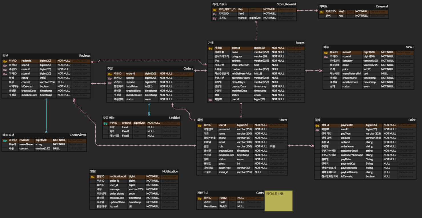 | 김정민 | @Juungmini0601 | 팀장 / 가게 및 메뉴 CRUD, 키워드 기반 통합 검색 |