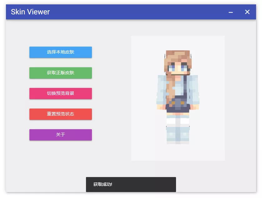 Electron-Minecraft-Skin-Viewer 一个简单的 Minecraft 皮肤查看器 运行 依赖项: Electron 运行命令: npm run start 或 electron . 预览图片