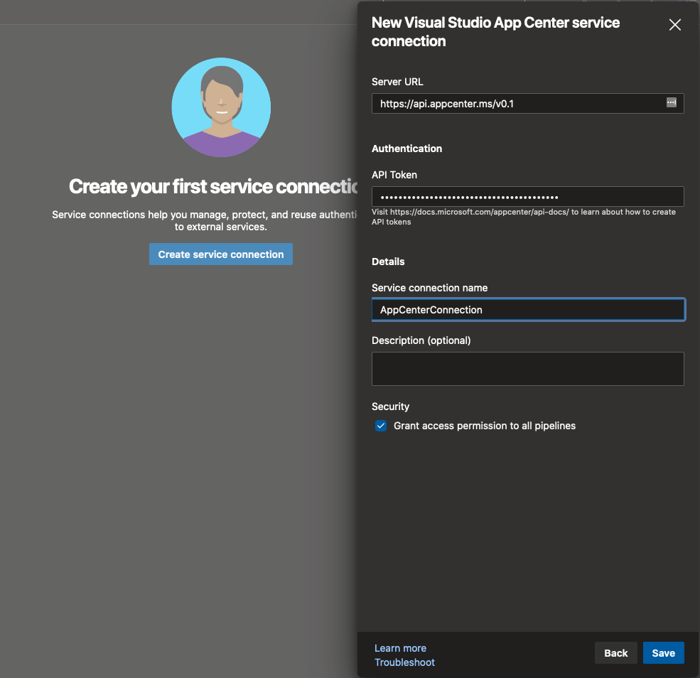 The next step is to create a service connection between Azure DevOps and AppCenter.