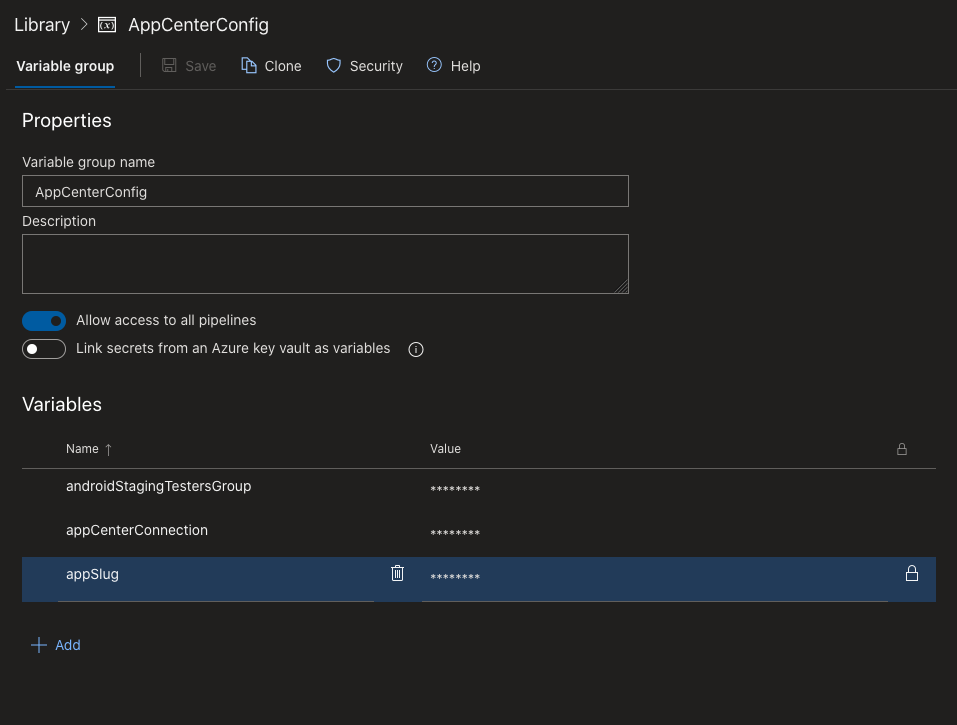 Go to Library-> Add new Variable group. Add AppCenter Connection. Add Slug Id: Username/AppName Add Group Id: paste the copied group id.