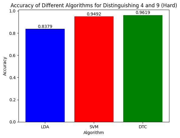 However, when distingushing between the hardest pair (4,9), it is evident that DTC did the best with 96% accuracy. SVM did slightly worse with around 95% whereas LDA was comparatively significantly worse with only 84% accuracy. This shows how the intricacy of the SVM and DTC algorithms are more beneficial at separating between closely knit clusters in our PCA feature space. Additionally, we can definitely expect that if we had increased the number of PCA components, LDA would have attained a much higher accuracy as well.