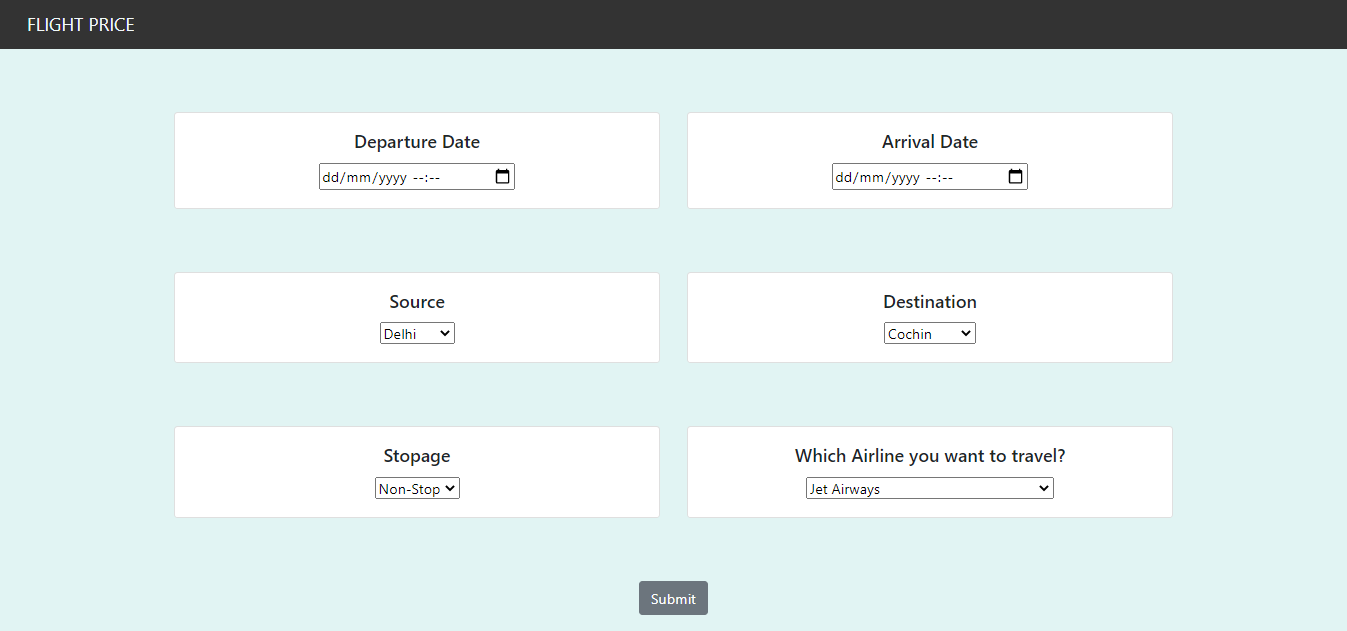 This project is a Flask web application that predicts the fare of flight tickets using machine learning algorithms. To estimate the price, the prediction model considers various factors such as departure date, arrival date, source, destination, stops, and airline preference.