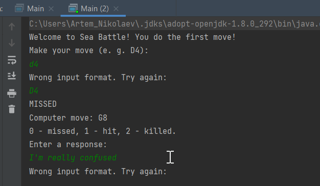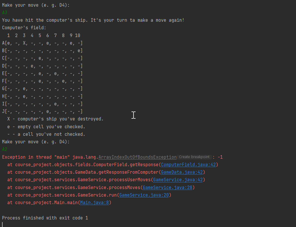 Good, I didn't find any bugs! As optional improvement, marking cells around a sunk ship as hit is a good idea. Approved!