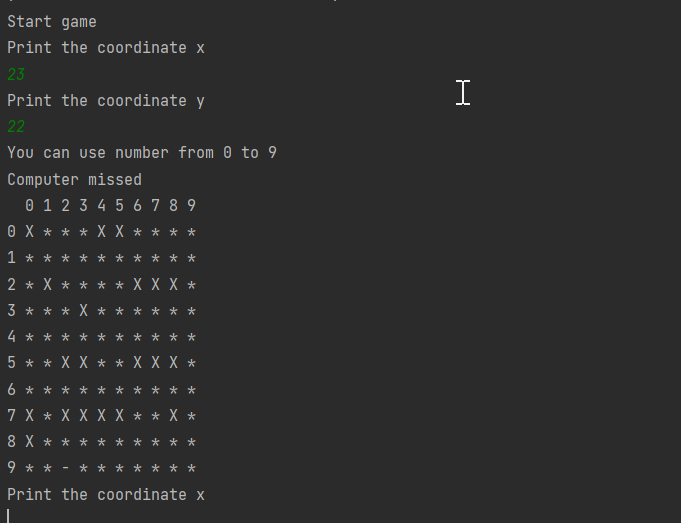 | field[ship.positionX + i][ship.positionY] = 'X'; | ||