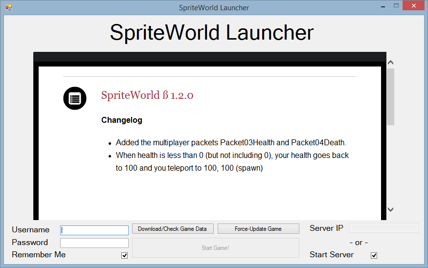 java -jar SpriteWorld.jar <username>,trueThen for the people connecting, if your on Windows, enter in the hoster's ip into the Connect to server box, and hit play. For those on Linux/Mac, you must run the following command;