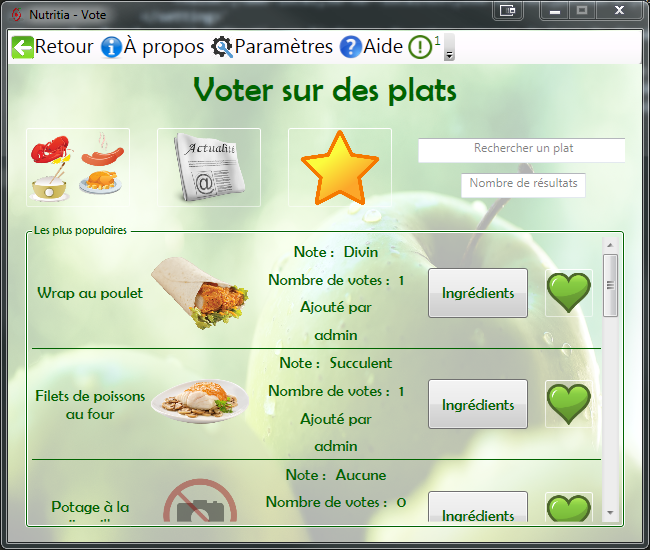 Menu de vote de plats.